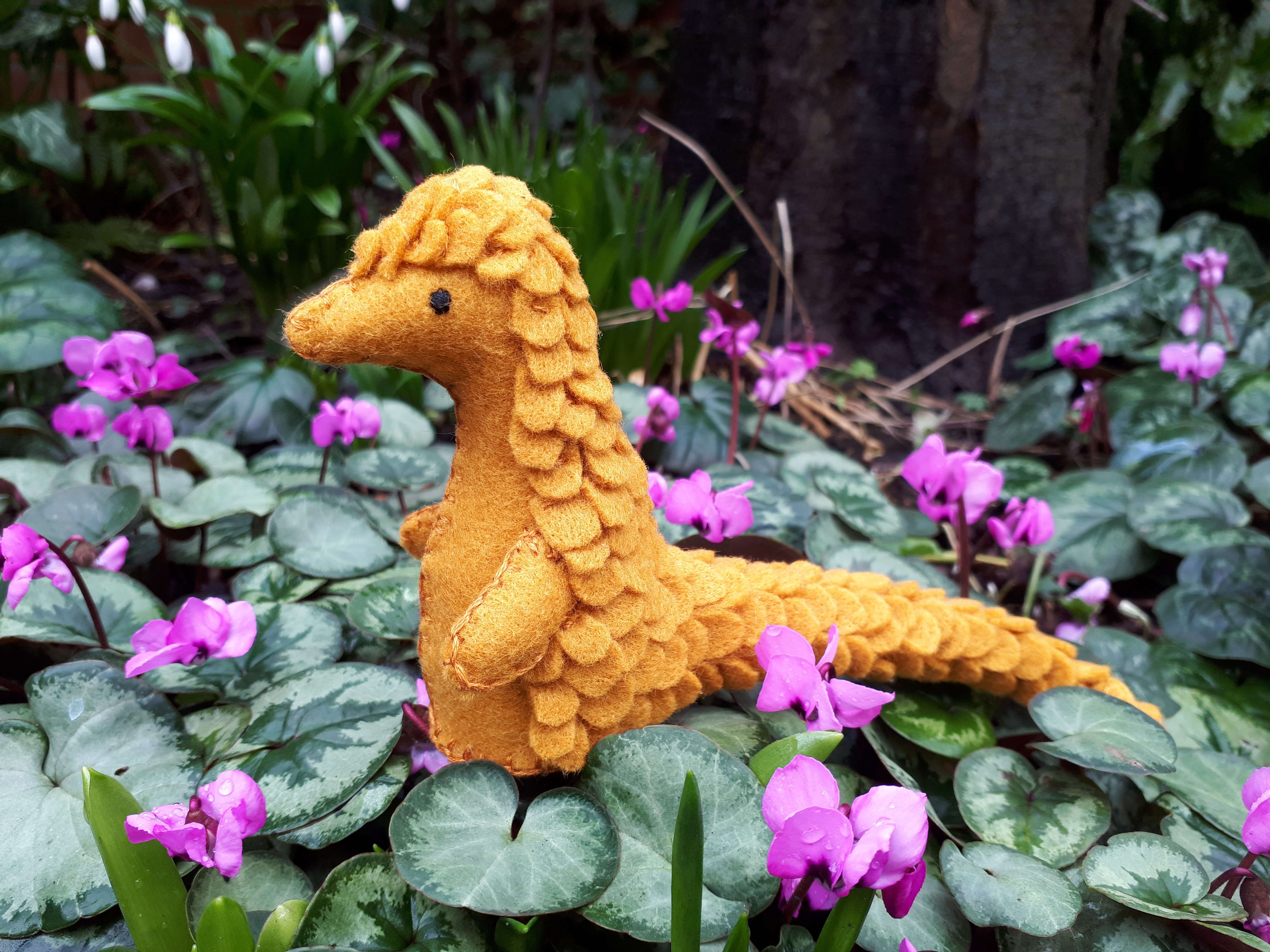 Like real pangolins, Pipisin Pangolin stands on his hind legs. So I thought I’d try to make a little felt pangolin – this is the result. If you can have a go at making your own pangolin companion, I’ve drawn the pattern and written what I did.